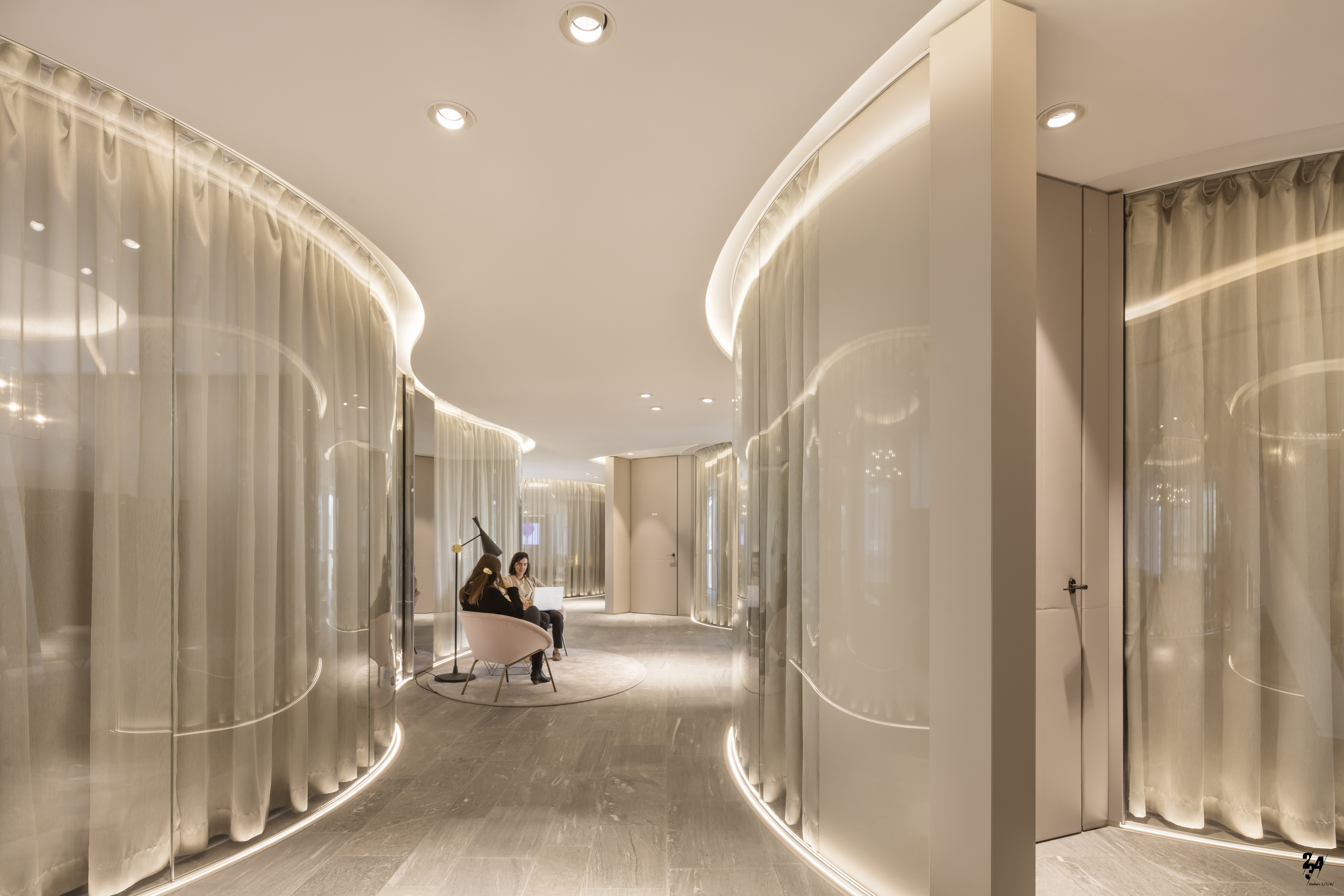 Le salon bar permet quant à lui d’organiser des cocktails et de proposer un lieu d’attente agréable et raffiné aux invités. Il bénéficie d’un large comptoir aux formes courbes, entièrement réalisé en laiton brossé. Sa façade en verre bombé, suivant avec souplesse la courbure du bar, est sublimée par l’intégration d’un tissu tendu rétroéclairé. Un grand écran permet de projeter des contenus pour des réunions informelles, tandis que le mobilier offre modularité et flexibilité pour transformer l’espace en fonction des besoins, que ce soit pour des soirées ou d’autres événements.